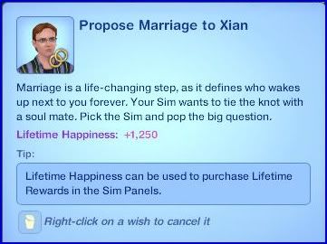 Uneventful normal sim life resumed after that until I saw "interlocking rings" icon appeared on Leslie's wishes panel. Yep, naturally she'd want to propose marriage the father of her son, but strangely enough I didn't see the same icon on Xian's wishes panel. Maybe Xian's "workaholic" trait is making him too busy to think of marriage yet... which outrightly contradicts his lifetime wish of having a big family. Maybe, I'll wait a bit to see if the same icon will appear on Xian's wish panel. Here's the pop-up window message after the"interlocking rings appeared on Leslie's wiches panel.